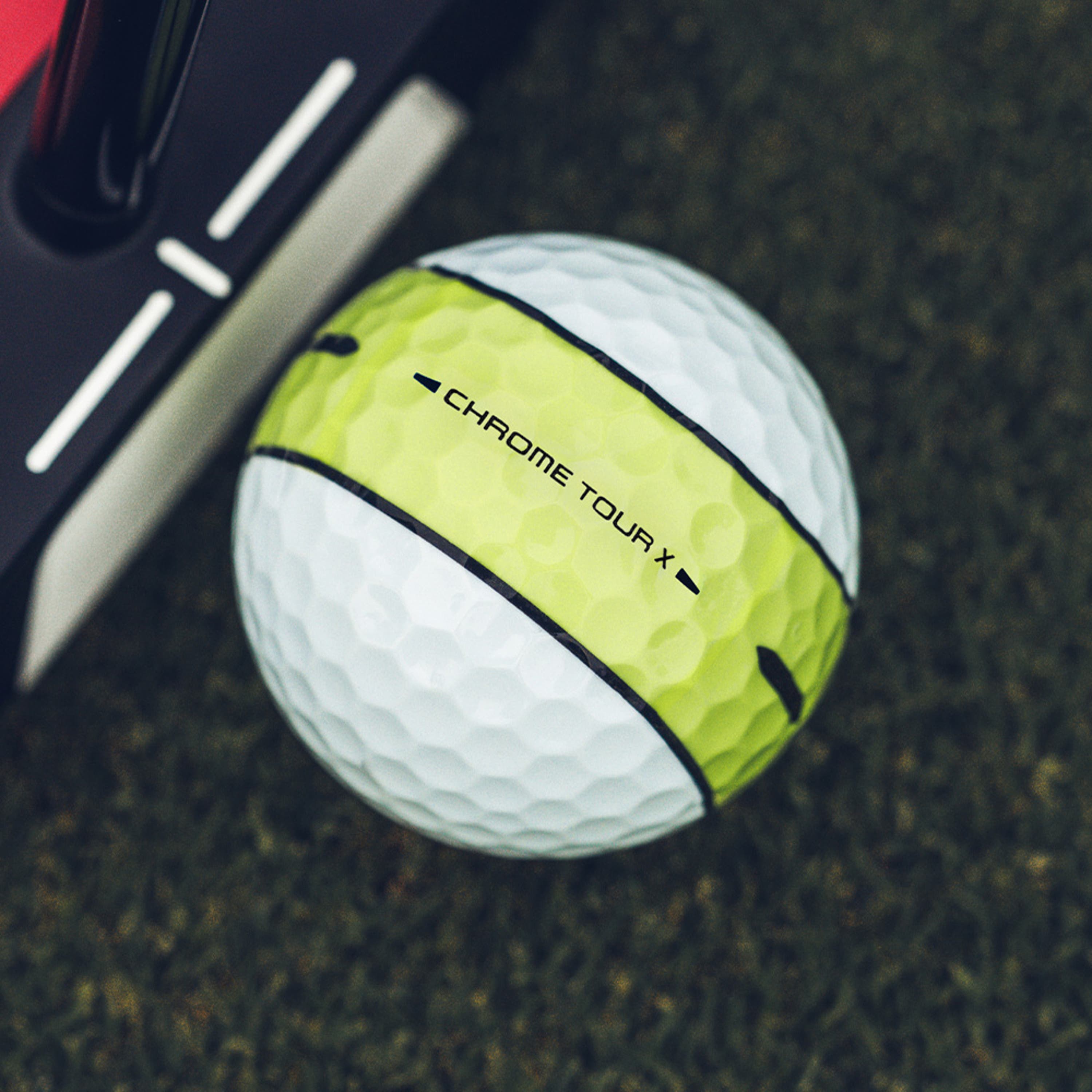 Chrome Tour X is engineered for outstanding tour performance with new speed technology for players who want maximum speed and ultimate control, outstanding distance, workability, spin and tee-to-green performance. Plus, 360° Yellow Stripe for clearer alignment.
